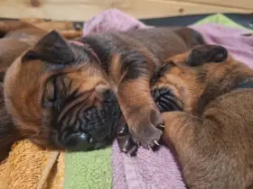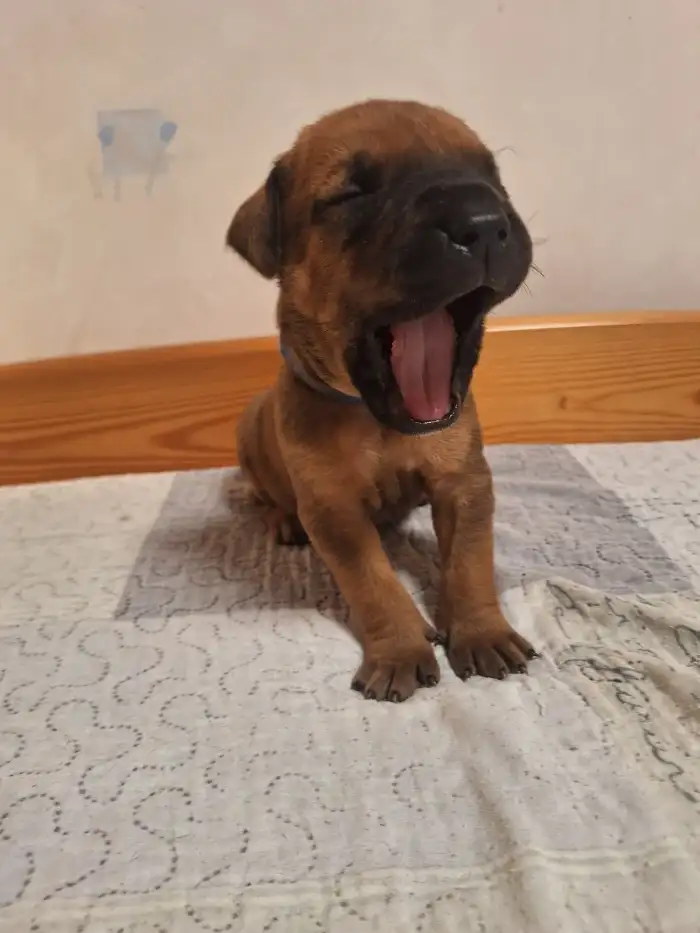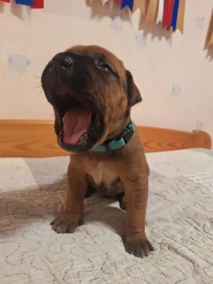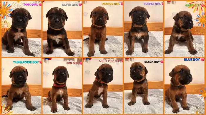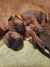 Prodám Německého boxera - Nabízím německého boxera bílé barvy s PP /chov. stanice LacBox/, nar. 7. 11. 2025, očkován 2x, očipován. Štěně má tmavé znaky, není albín. Foto přiloženo, další fotky mám k...