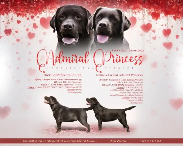 CHS Admiral Princess nabízí čokoládové štěňátka Labradorského Retrievera s PP. Štěňátka po zdravých rodičích s typickou labradoří povahou dle stanov FCI.Rodiče štěňátek oba HD A/A,ED 0/0,OCD 0/0,PRA,EIC,HNPK,CNM,Cystynurie,SD2 vše čisté N/N.Štěňátka budou do svých domovů odcházet po Velikonocích ,s PP,kupní smlouvou ,odčervení3 x ,očkovaní 1x,chovatelský balíček,Pet pass.Kontakt s naší malou CHS napořád .Labradoři nás provází životem 25 let.U nás můžete vidět generaci rodičů Vašich štěňátek ,prababičky,babičky,matky,tety .Pro více ifo prosím piště nebo volejte,stránky CHS : https://admiralprincess.wixsite.com/admiralprincess/stenatka