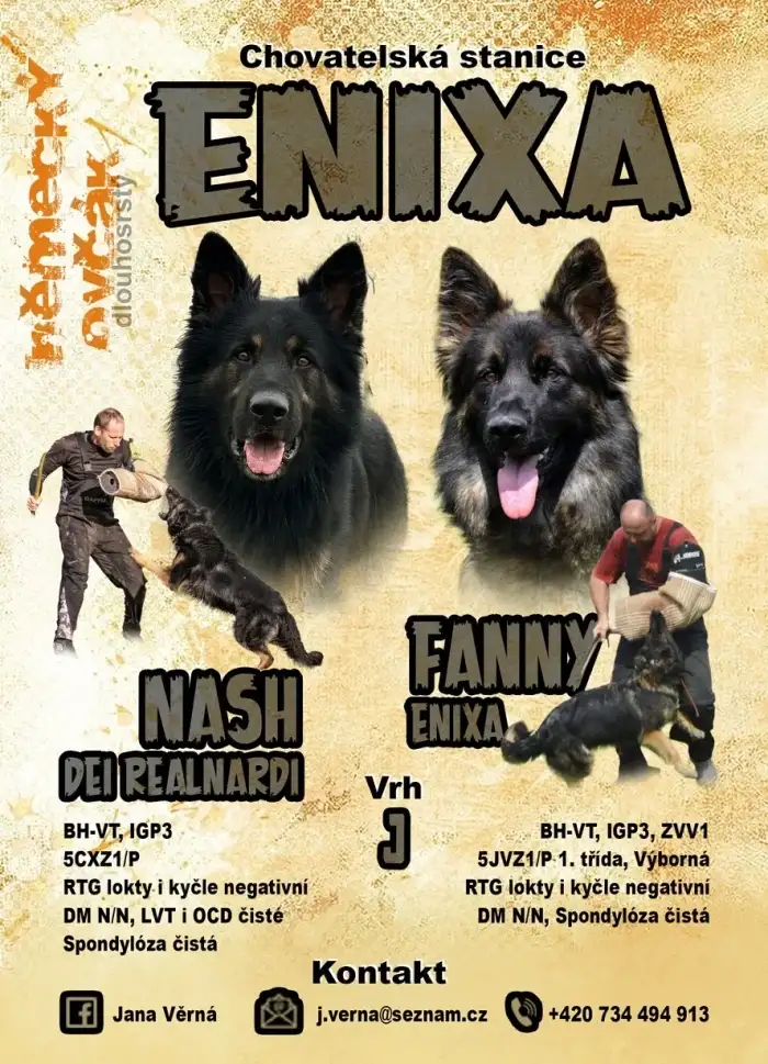 Chovatelská stanice Enixa se zaměřuje na kvalitní pracovní a exteriérové linie německých ovčáků. Zde je krátký přehled, který vystihuje naši filozofii: 🐕 Chovatelská stanice Enixa: Tradice a kvalita Stanice se dlouhodobě soustředí na chov psů, kteří nejsou jen „krásní na pohled“, ale mají především pevné zdraví a vyrovnanou povahu. U německých ovčáků (včetně dlouhosrstých variant) kladou důraz na: Zdravotní prověřenost: Důsledné sledování rentgenů kyčlí a loktů (DKK, DLK), DM a dalším zdravotních věcí, což je u tohoto plemene klíčové. Pracovní vlohy: Psi z této stanice mají často vynikající kořistnický pud a ochotu pracovat, což z nich dělá skvělé parťáky pro sportovní kynologii i spolehlivé ochránce rodiny. Špičkový pigment: Jejich odchovy bývají typické výrazným, sytým pálením a kvalitní srstí.