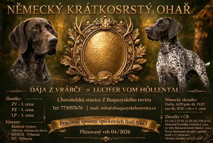 Zadám štěňata Německého krátkosrstého ohaře po lovecky vedených rodičích. Jedná se o hnědého bělouše s plotnami. Otec: Německé zkoušky: Derby, AZP/pole 4h, VGP/nos 4h, BTR / vše v 1. ceně Zkoušky v ČR: ZV, CACT ZV , PZ, LZ, PZ, BZ, ZVP, 2x VZ, Memoriál Františka Vojtěcha I. cena, 2x vítěz Memoriál Josefa Haufa I. cena první všestranné zkoušky úspěšně složil v 17 měsících / všechny zkoušky má v 1. ceně, Matka: jarní svod výborná, zkoušky vloh I. cena, Vodní práce I. cena, Podzimní zkoušky I. cena, Klubová výstava NKO Výborna 1, Speciální výstava |NKO V1, Lesní zkoušky I. cena, všechny zkoušky má v první ceně. Štěně bude předáno s očkováním, průkaze PP, a s tetováním a čipem. K odebrání za II. týden v červnu 2026
