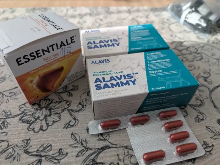 - doplněk Essentiale (játra, i pro lidi) - celkem v balení zbývá 77 kapslí, expirace 7/2027. Cena 200 Kč.