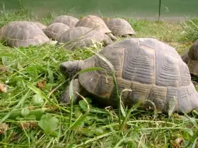 Prodám Želvu zelenavou - Dvě suchozemské želvy včetně teraria 50x50x150 cm, želvy nar. 2015, s doklady, pouze spolu, jsou na sebe zvyklé od vylíhnutí.