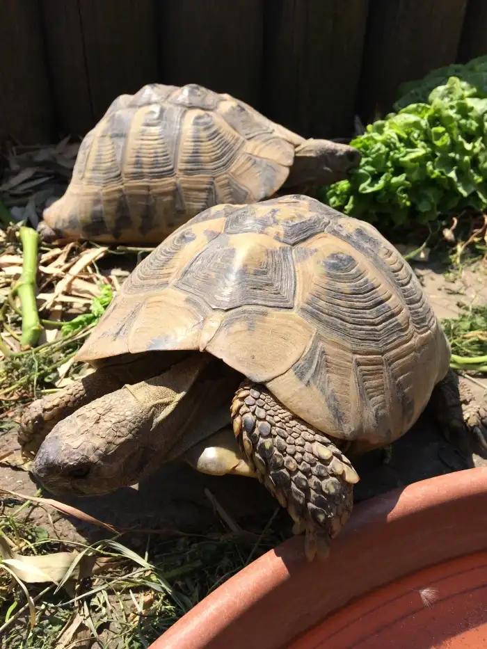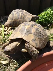 Prodám Želvu zelenavou - Dvě suchozemské želvy jako domácí mazlíčky stáří 10 let, oba kluci, zvyklí spolu. Včetně komplet vybaveného terária 150x60x50 cm. Doklady Cites.