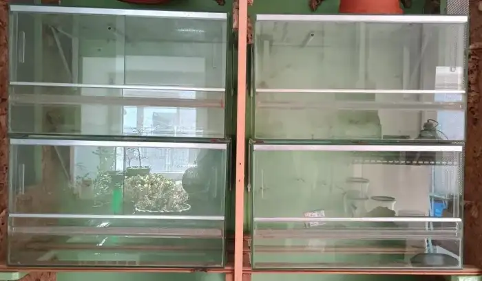 Prodám 2x terárium o rozměrech 60*55*45 cm. Terária mají posuvná dvířka, větrání z horní a přední strany . Vhodné pro spoustu zvířat ( např. pro želvy, gekony, agamy, atd. ... ). Terária jsou málo, kr...