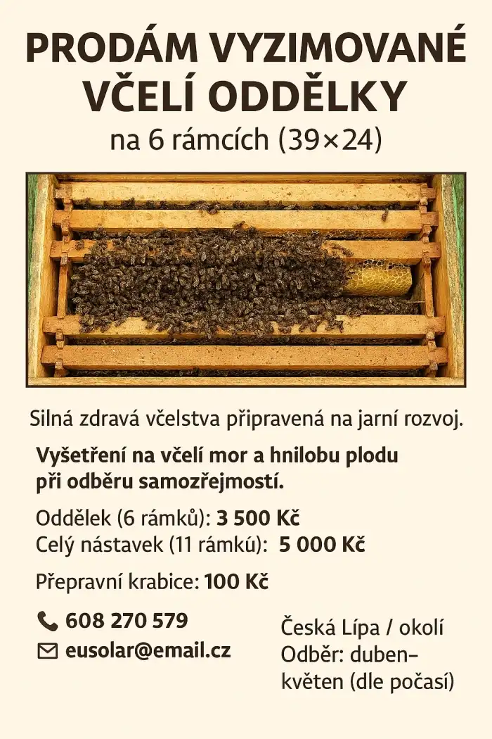 Prodám vyzimovaná včelstva na RM 39x24 na jednom nástavku. Při odběru včelstev bude doloženo vyšetření na mor včelího plodu, hnilobu včelího plodu a výsledek spadu měli na kleštíka včelího. Matky líhn...