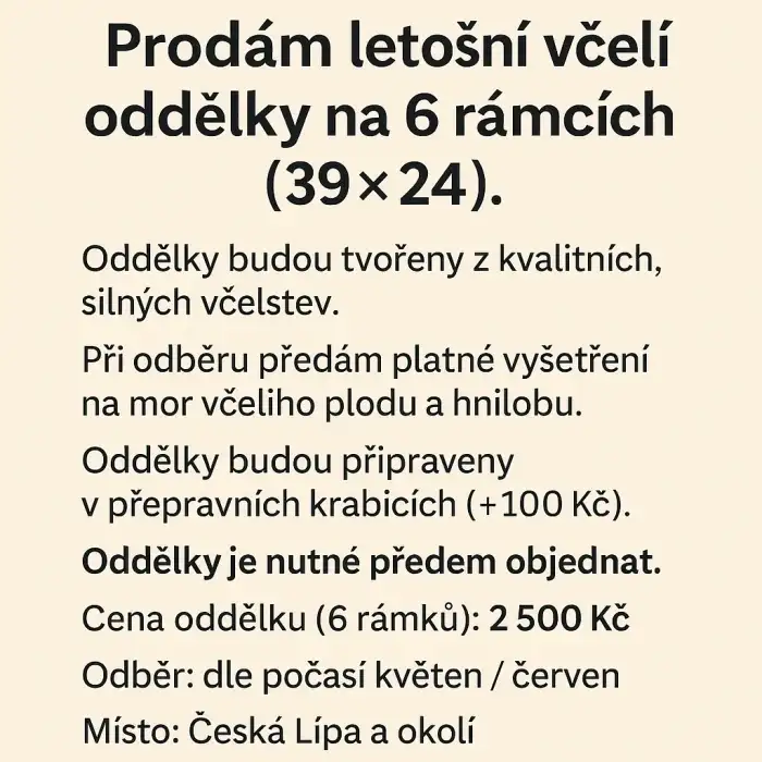 Prodám vyzimovaná včelstva na 11 rámcích s mladou matkou.R.m. 39 x 24 vyšetření na mor je samozřejmností. Stanoviště Chrastavec Cena 3500,-